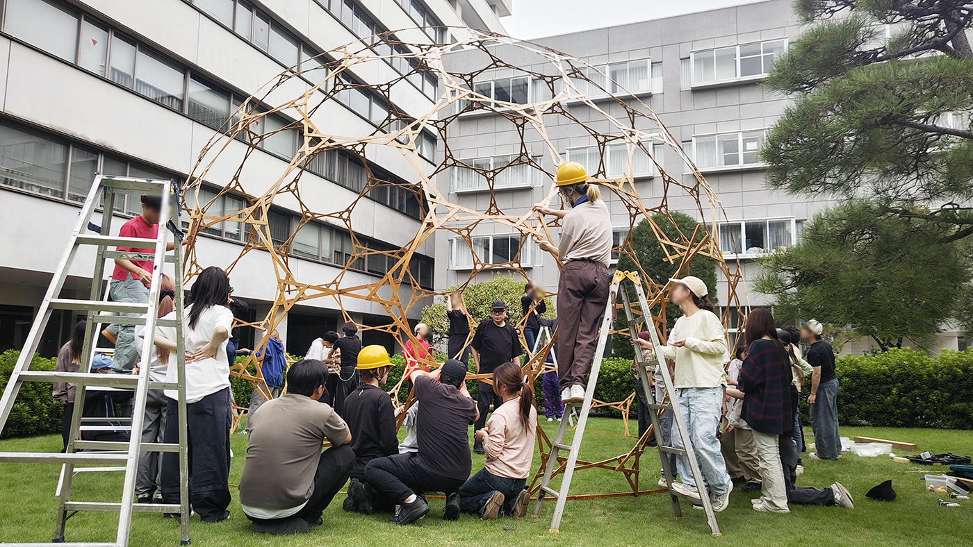 基礎デザイン学科が竹でジオデシックドームを作る授業をやってた。