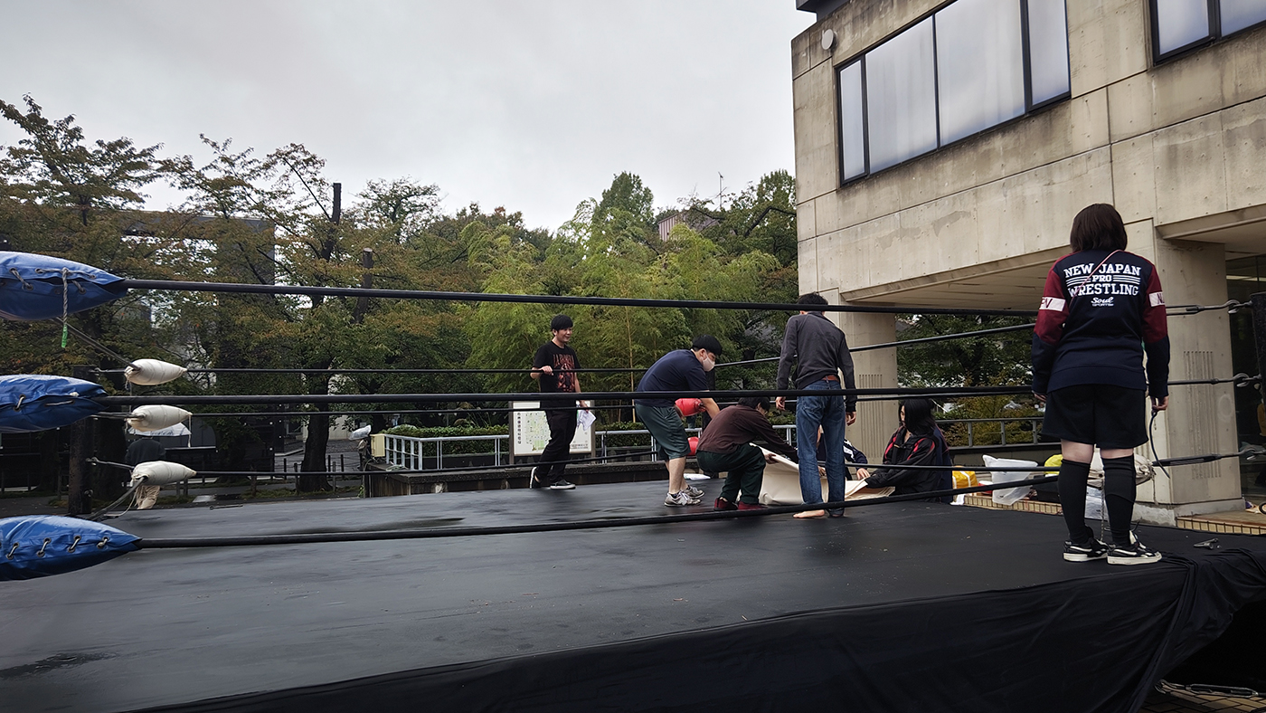 手羽がムサビ芸祭で一番楽しみにしてる企画と言ってもいいだけに「雨の中でもやってくれるの?」と学生さんに声をかけると、「せっかくリング作ったんで1試合だけでもやる準備だけはやっておこうと思って」と。