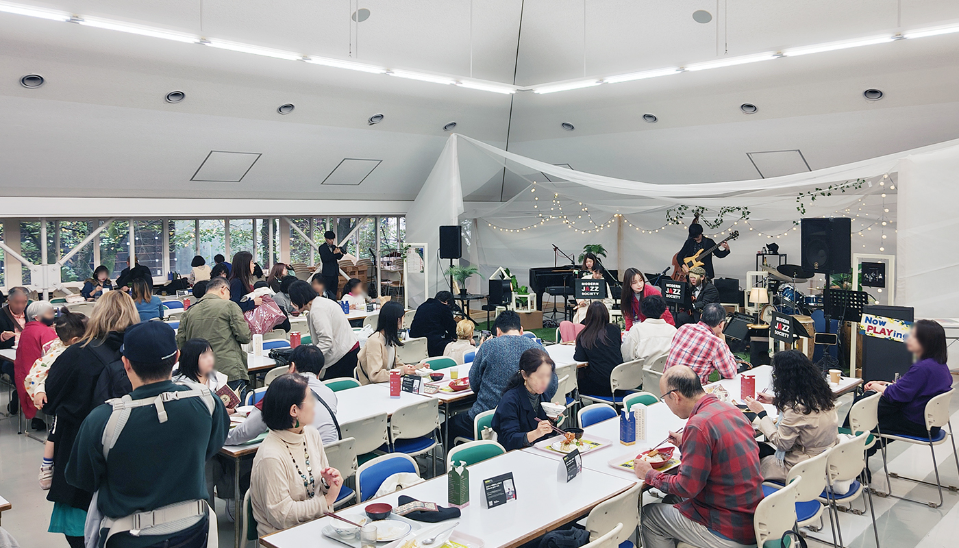 ジャズ研「Modern Jazz Society」は鷹の台ホール2階第1食堂がライブ会場。学食で食事を取ることもできます。