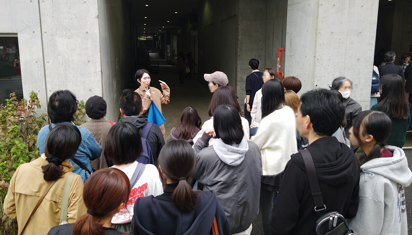 「皆さん、『他のグループのガイドは若い職員なのに自分だけおっさんがガイド役だ・・』と思ったでしょ?でも、実はムサビに一番詳しい職員は私なので、皆さん、当たりなんです!」が最初の受けポイント。(多分受けてる。多分)