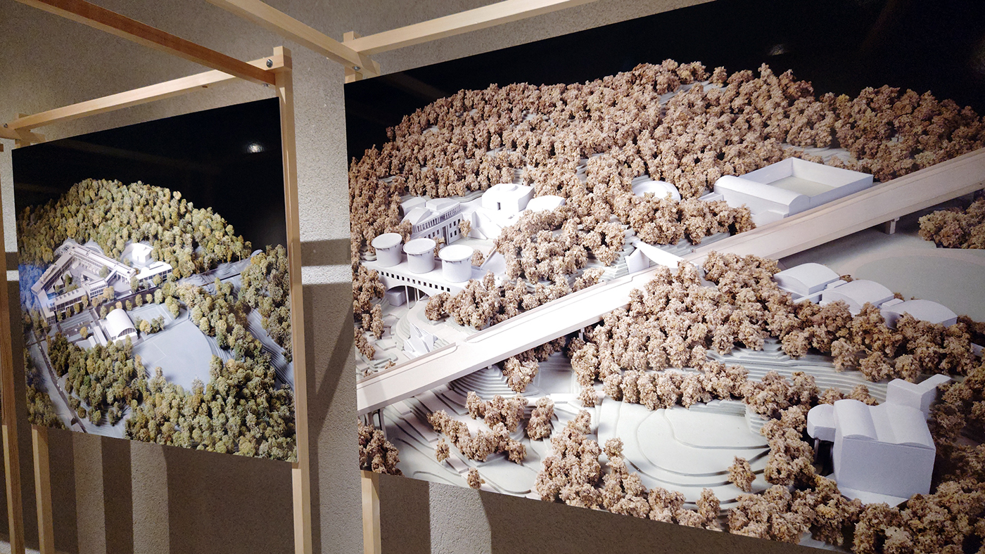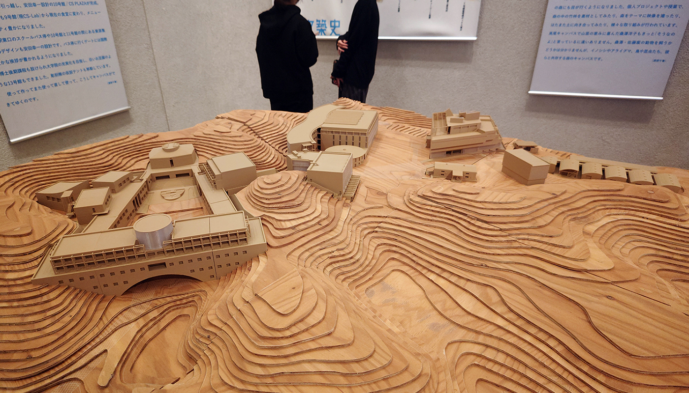 コンペ模型写真を見ると、この段階で計画道路が通ることを見越してキャンパス設計されてますね。