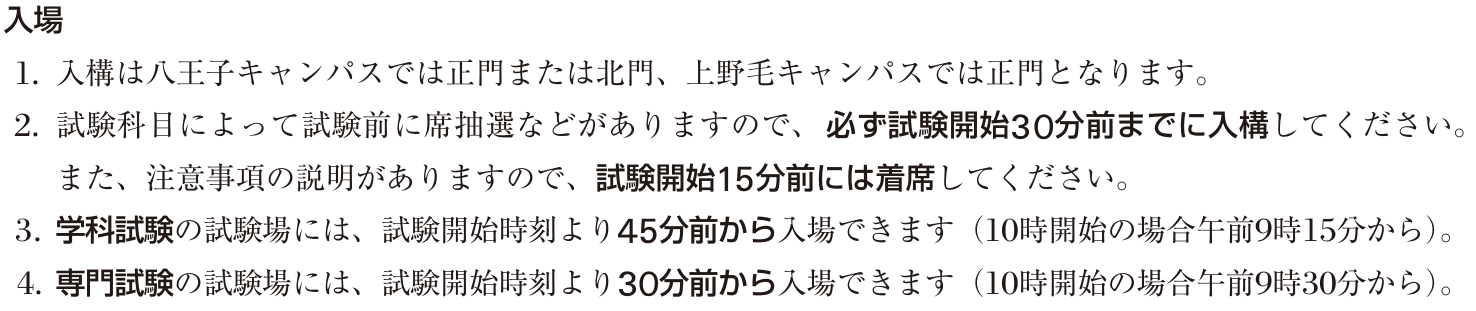 「9時30分試験開始の場合は8時頃から入構できるけど、抽選で席を決める試験は教室に入れるのは9時頃(「目途」だからそれより前後する可能性あり)」と書かれてます。