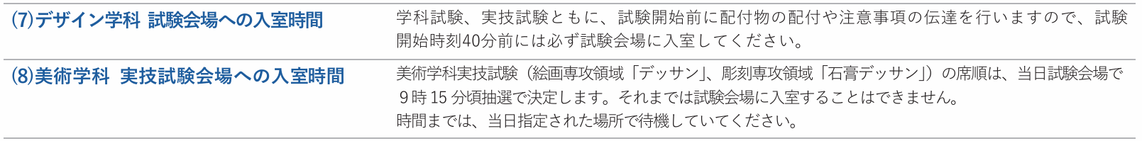 デザイン学科の学科試験・実技試験は40分前までに入室しないといけないけど、美術学科の絵画「デッサン」・彫刻「石膏デッサン」は9時15分頃に抽選で席を決めるから、それまで教室に入れない、と書いてある意味がわかるはず。