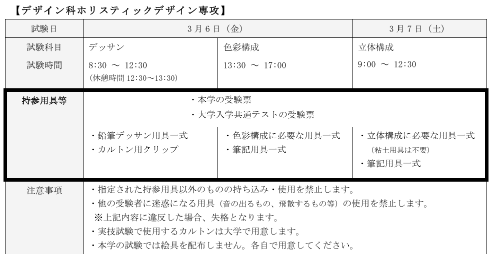 ホリスティックデザイン専攻は去年は書かれてなかった「他の受験者に迷惑になる用具(音の出るもの、飛散するもの等)の使用を禁止します。」という文言が追加されてたりします。