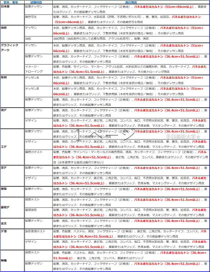 絵画と彫刻は「木炭デッサン用下敷き用紙(白紙)」が持参用具に入ってたりするんで、ちゃんと募集要項を確認してね。(下敷用紙1枚だけ折らずに持っていくのは難しいから結局カルトンを持参することになりそうな気もするけど皆さんどうしてるんだろ?丸めてるのかな?)