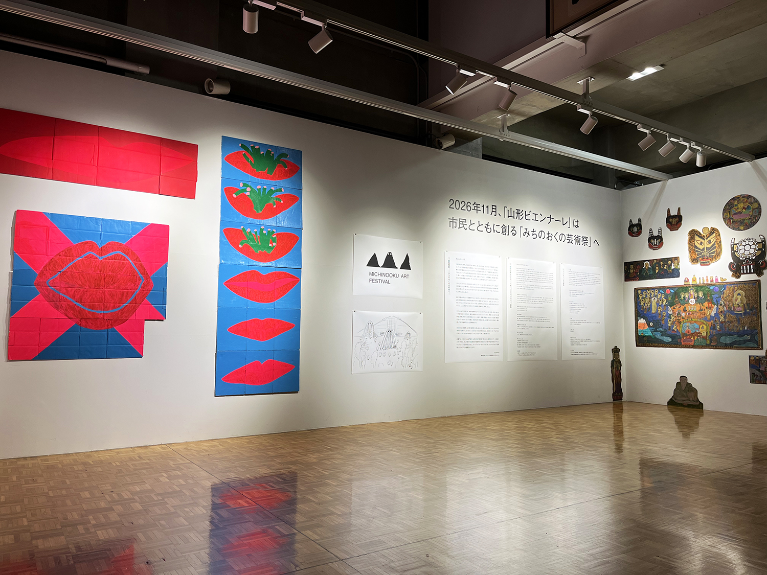 2026年11月山形美術館を主会場に開催される「みちのおくの芸術祭」の概要やロゴ、出品予定作家の作品などを東北芸術工科大学 本館1Fギャラリー THE WALLでて4月28日(火)まで展示。
